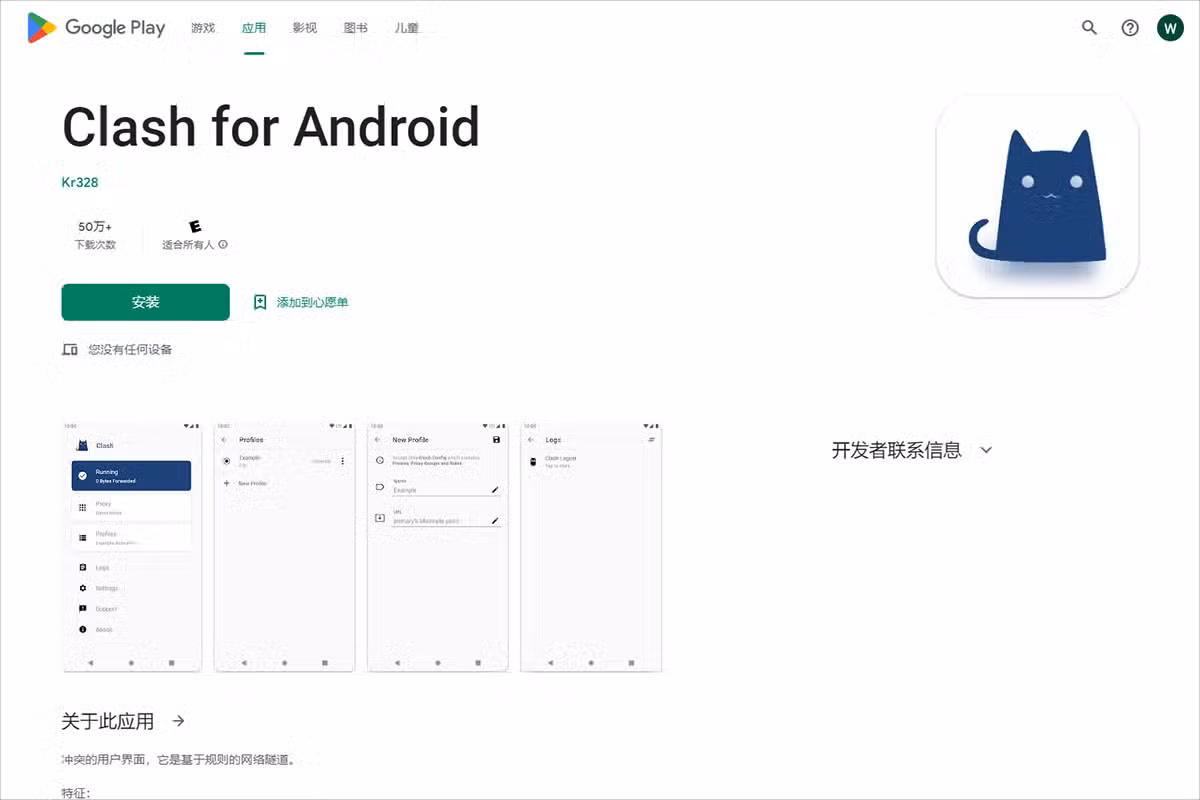 或打开应用商店地址:https://play.google.com/store/apps/details?id=com.github.kr328.clash 直接下载并在线安装。